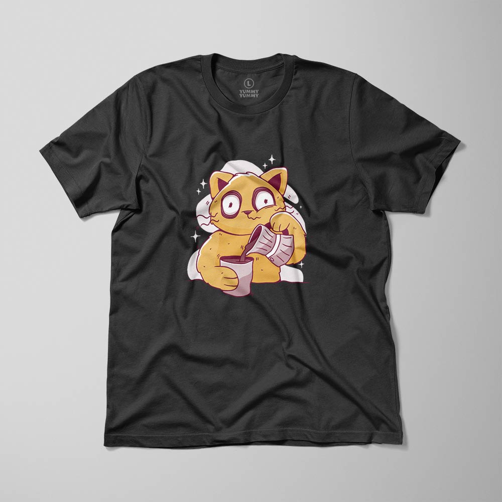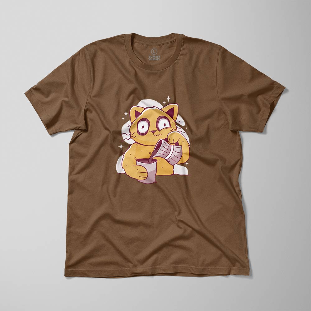 Prezentujemy męską koszulkę, która łączy w sobie dawkę kofeiny z dawką uśmiechu. Nasz nadruk z kotem, który serwuje kawę prosto z kawiarki do kubka, to nie tylko ubranie, to wyjątkowy moment kociej pasji i aromatu kawy.